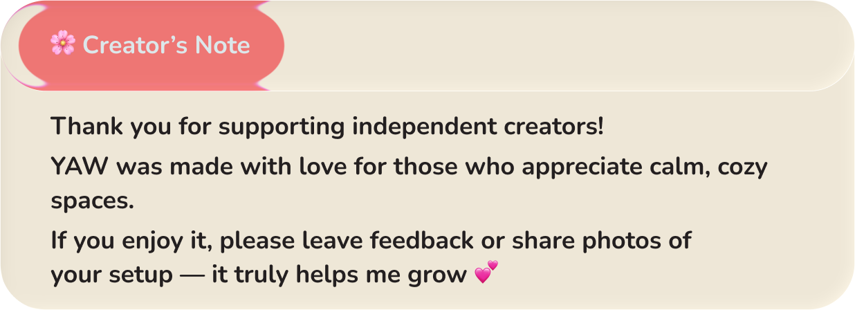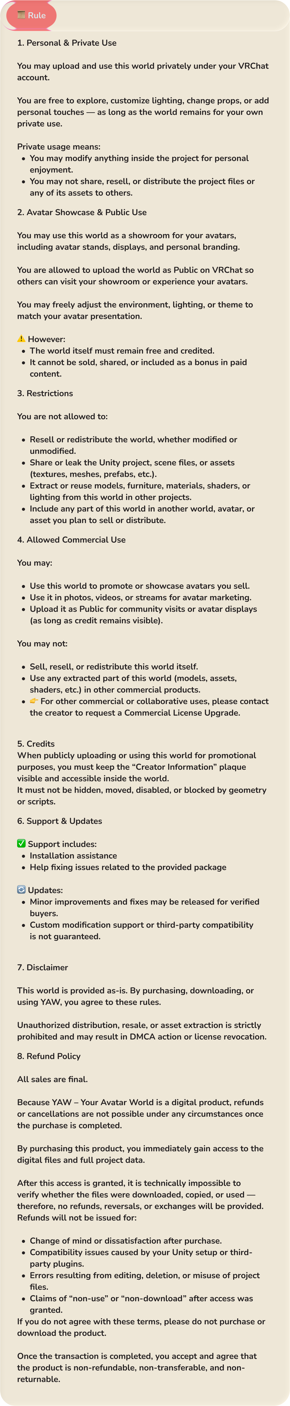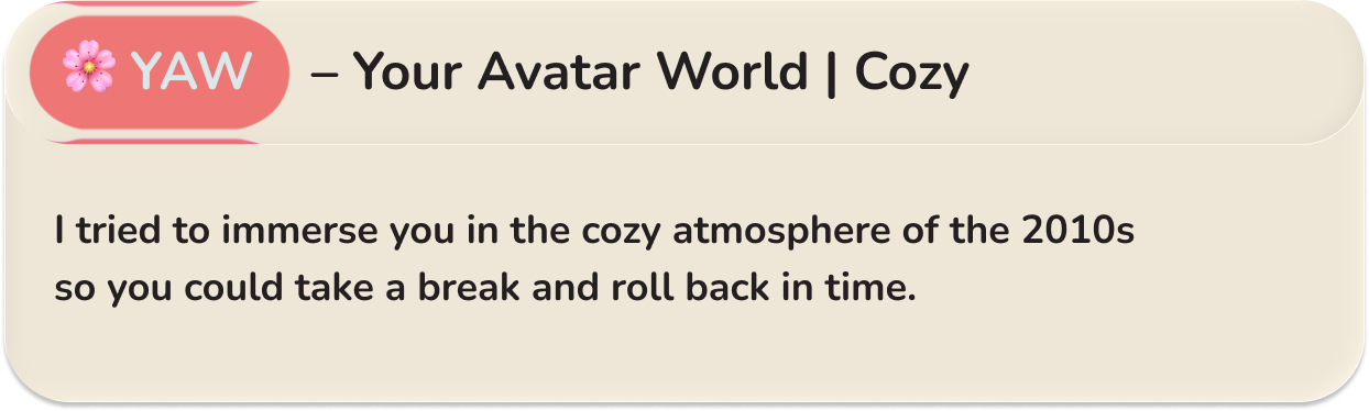 YAW (YOUR AVATAR WORLD) | Cozy$35$35https://schema.org/InStockusdSLI_SLI_1 ratinghttps://jinxxy.com/Sli_zen?jc=d911abd561539e67390cbc5dfe137d4b8b1c7bd66863909e8438I want this!2 salesYou get a cozy world Add to wishlist New wishlistShareShare on XShare on Facebook Copy linkCopy product URLNo refunds allowedRatings5(1 rating)155 stars100%4 stars0%3 stars0%2 stars0%1 star0%